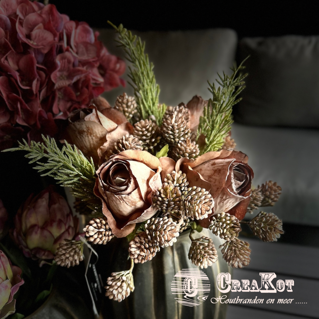 Prachtige sobere roosjes in de kleur bruin. De roosjes hebben 5 stelen per bosje. Deze heb ik gecombineerd met mini dennenappeltjes kunsttakken. Voor een compleet bosje ! Leuk voor in een vaas of pot !