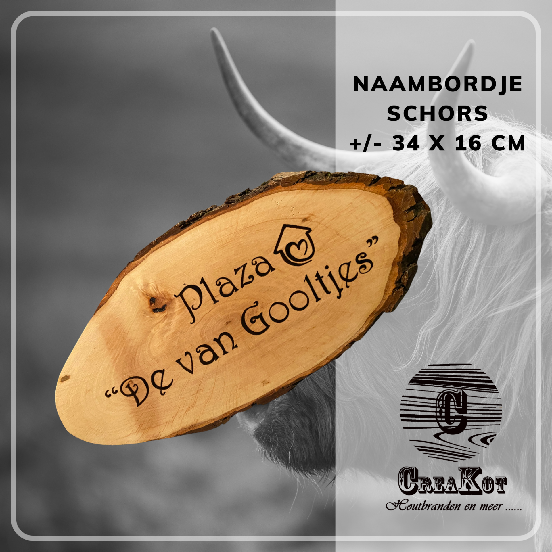 Naambordje ovaal met schors, gebrand met tekst naar keuze.